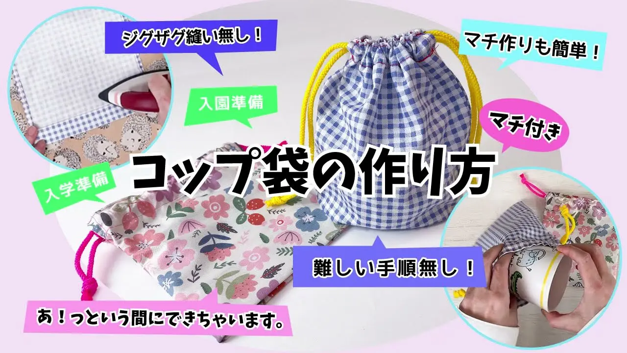 タイトル簡単!ジグザグミシン不要!マチ付きのコップ袋・コップ入れ巾着の作り方