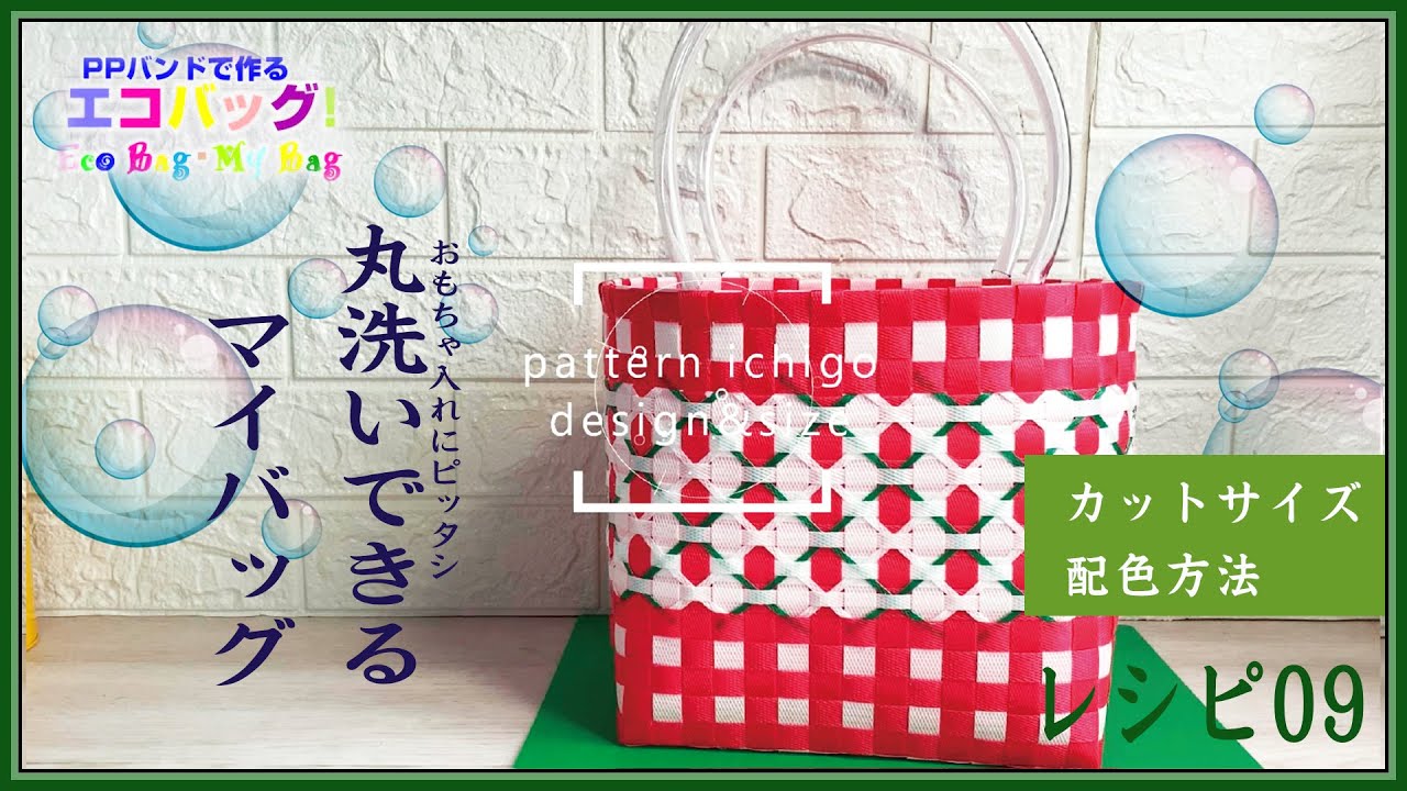 タイトル【PPバンドカゴ作り方】丸洗いできる!ギンガムチェックが可愛い「イチゴ柄マイバッグ」カットサイズ&配色