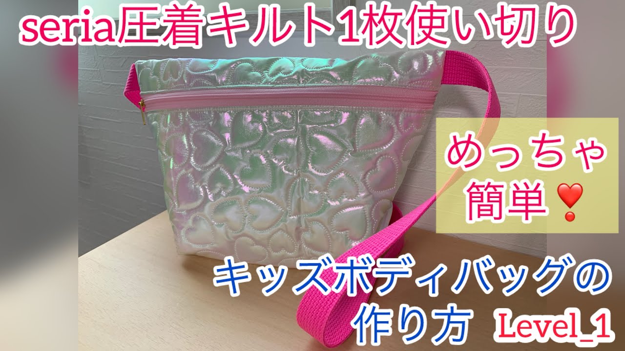 タイトル100均DIY!セリア圧着キルト1枚使い切り!定規不要!裁断無し!めちゃくちゃ簡単!キッズボディバッグの作り方◎