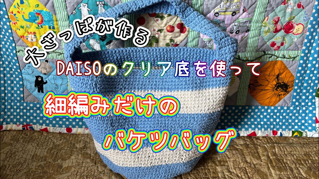 タイトル【かぎ針】ダイソーのクリア底を使って細編みだけの簡単バケツバッグ【編み物】