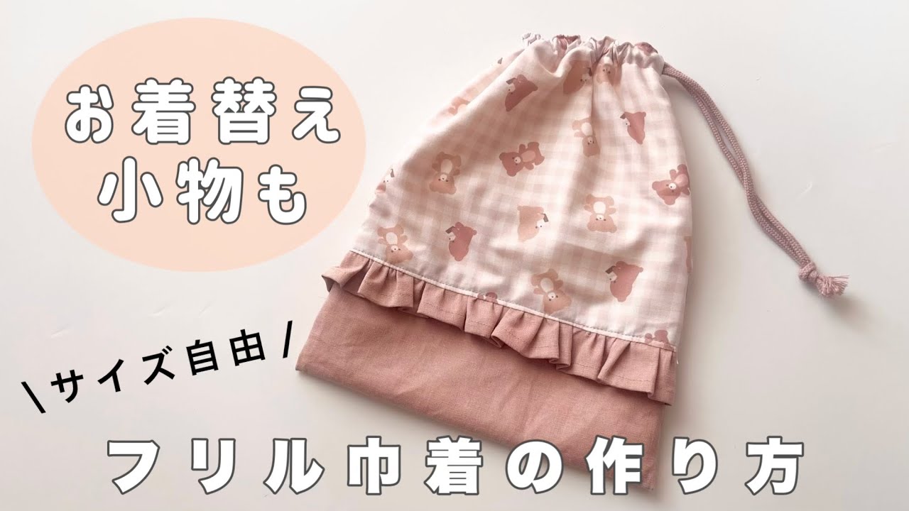 タイトル【選べるサイズ】簡単で可愛い!裏地付きフリル巾着袋の作り方【サイズ自由!お着替え袋にもおすすめ】100均diy